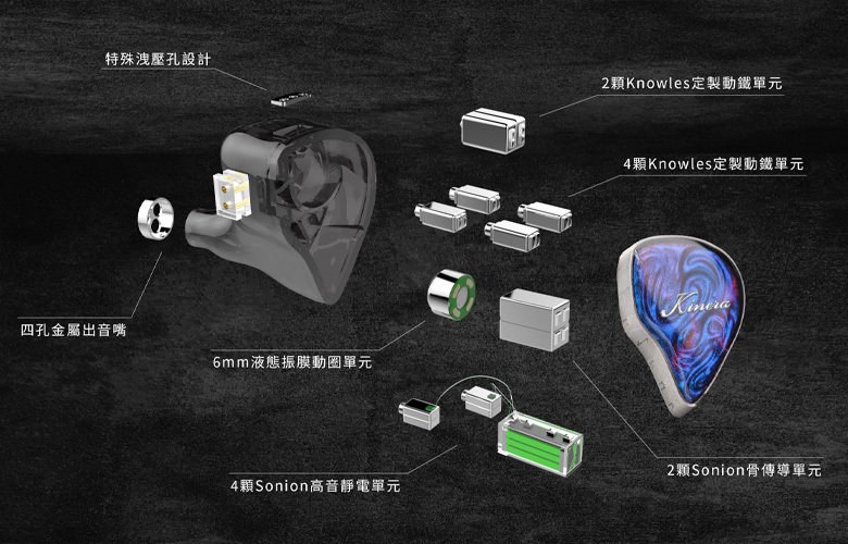 Loki Divine Mark 採用了四混合十三單元架構,低頻由 Kinera 自家研發的 6mm 液態振膜動圈單元驅動,確保深沉飽滿的低音表現。中頻至中高頻則配置「4+2」Knowles定製動鐵單元組合,實現自然流暢的音色過渡,細節豐富而精準。超高頻段由四顆 Sonion 靜電單元主導,搭配金屬出音嘴設計,精確控制聲波傳播,拓展高頻延伸,呈現細膩明亮卻不失溫潤的音質。 此外,品牌特別額外加入多一顆 Sonion 骨傳導單元,能夠進一步豐富聲音質感和空氣感,與動圈單元共同協作,確保整體頻寬保持順暢自然的音色。無論是聲音細節還是空間感的的營造,皆超越了前代 Loki 的聲音上限。