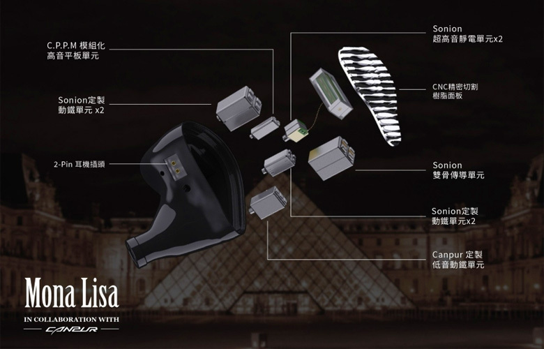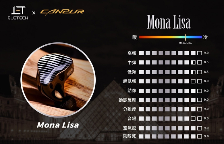 Eletech 與 Canpur 兩大音響巨擘聯手,融合各自在聲學工程與調音藝術上的深厚造詣,共同打造出限量版聯乘款作品「Mona Lisa|蒙娜麗莎」。採用了先進的四混合十單元架構,薈萃了 Sonion 的頂尖單元技術,包含雙超高音靜電單元、雙骨傳導單元、四顆定制動鐵單元,以及由 Canpur 獨家研發的低音動鐵單元,其低頻表現媲美動圈單元的渾厚力道。Mona Lisa|蒙娜麗莎 更首度搭載了 Canpur 專門為高頻調校的「C.P.P.M. 模組化平板單元」,大幅提升高頻清晰度與空間結像。配合精心調配的專屬耳機線材「The Louvre」,能夠呈現均衡而細膩的音色,同時能夠彰顯整體的氛圍感及人聲層次,宛如《蒙娜麗莎》畫中豐富的情感與色彩對比。