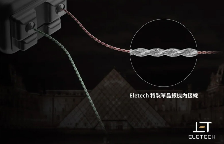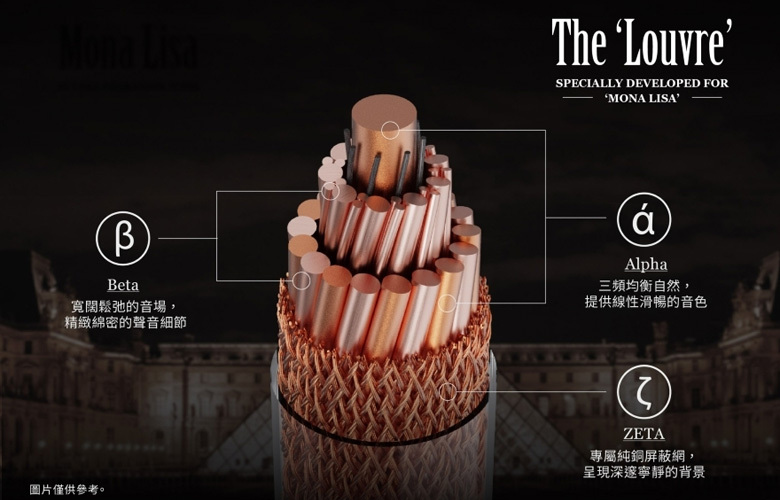 Eletech 特別為 The Louvre 加入「三重定製頂級純銅物料」融合技術,每一款導體皆針對特定頻段精心研發,分別透過三組由純銅所構建而成的線芯導體以及屏蔽網 — α|β| ζ。在按照不同尺寸與頻段傳輸速度,遵循 Eletech 的多尺寸絞合設計與獨創的幾何排列編織法,為 Mona Lisa 打造出全面而豐富的聲音特質。