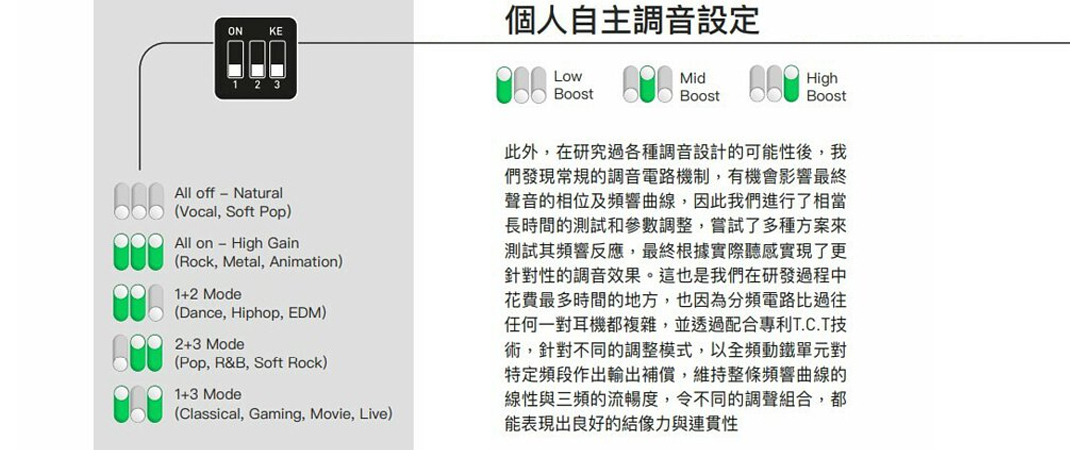 True Crossover Technology(T.C.T)是一種先進又富有 特點的分頻技術,透過全頻動鐵單元來對頻段的過渡點 作出補償,在不產生相位失真的基礎下,來得出順暢、 互補的三頻過渡。這個技術可以徹底地將發聲單元的聲 音融合,表現良好的聲音連貫性;也令單元保持最理想 的工作狀態,使最終訊號擁有更高的準確度。