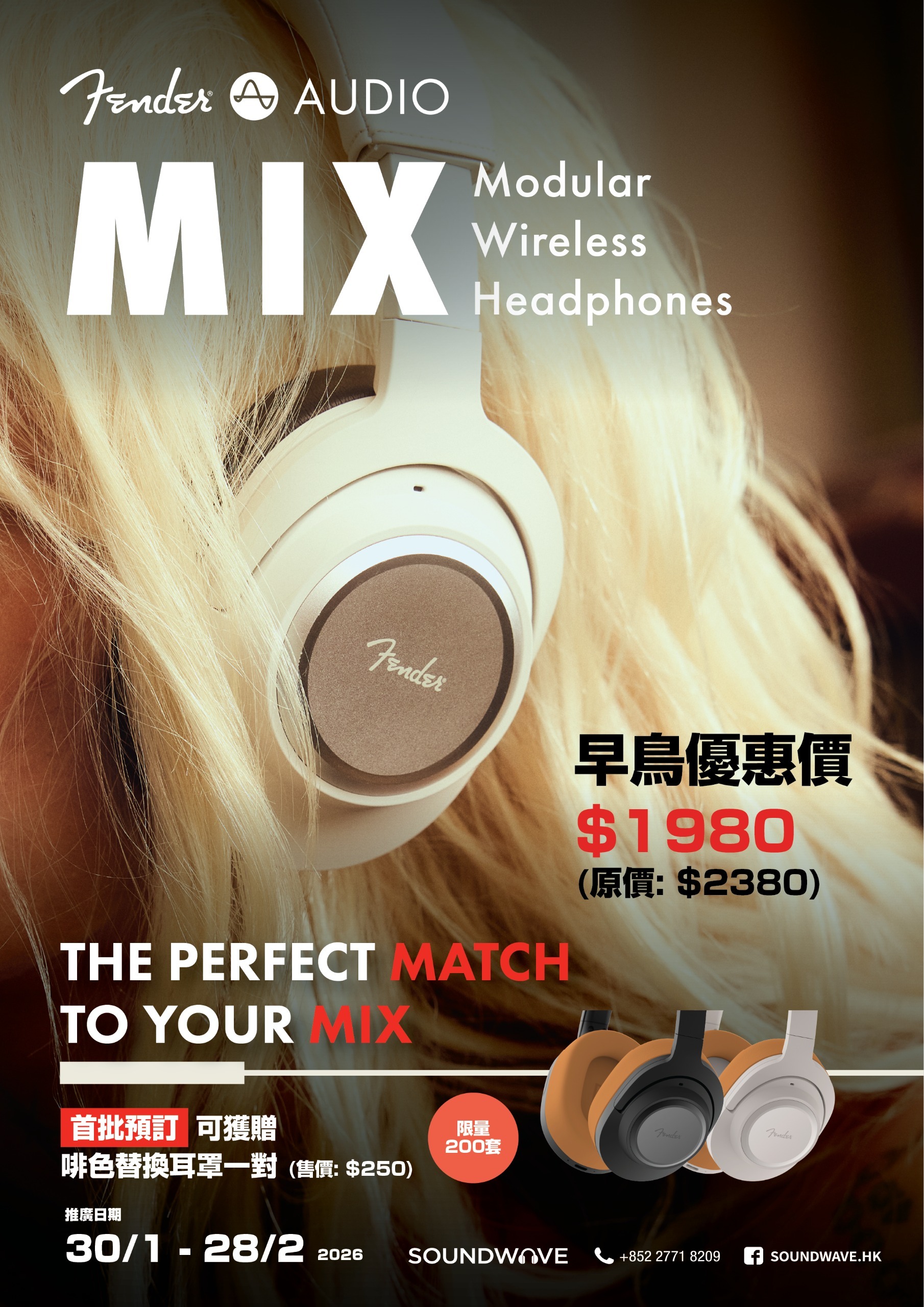 美國傳奇音器品牌 Fender 的無線耳機系列,推出首款主動式降噪頭戴藍牙耳機 Fender Audio MIX。這個在音樂界叱吒超過 70 年的結他品牌,把他們對聲音的執著和美學品味,全都注入這副耳機裡。從低調奢華的 Skyscraper Black 都市黑、純淨典雅的 Olympic White 奧林匹克白,兩款最簡約耐看的配色,更印上辨識度超高的 Fender 品牌標誌,突出你的音樂品味。耳機設有五方向實體 Joystick 型操作鍵,即使冬天戴手套也能輕鬆操作;流線型的機身配上可拆式記憶海棉耳罩與頭帶,戴起來輕盈舒適;內藏 USB-C Dongle 輕易享受 24-bit/96kHz 高清音樂;更可輕鬆自由換件換色,無論你今天是休閒打扮還是正式造型,MIX 都能完美融入你的風格,更能顯出你個人品味風格。