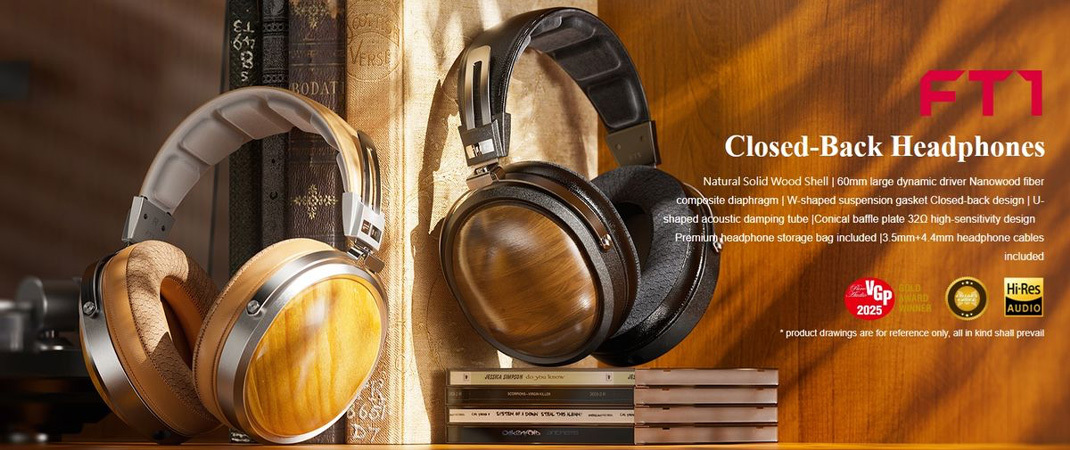 FiiO FT1 搭載自主研發第二代 60mm 大尺寸動圈單元,是聲學團隊為 FiiO 首款封閉式頭戴耳機量身打造之作。耳機外殼選用北美 FAS 級黑胡桃實木,紋路流暢,質感細膩,沉浸式感受來自原始木料的自然美感。