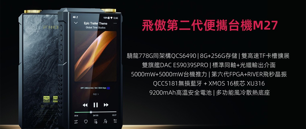 FiiO 便攜式音樂播放機系列的巔峰 M27 是目前 FiiO 行動播放機產品線的最高階機種,位列 JM21、M21、M23 之上,硬體規格大幅升級。搭載 Qualcomm QCS6490 晶片,內含 8 核 Kryo 670 CPU、Adreno 642L GPU,並使用 Android 13 作業系統與 8GB RAM,整體表現媲美高階智慧型手機,但是是以 Hi-Fi 體驗作為核心。