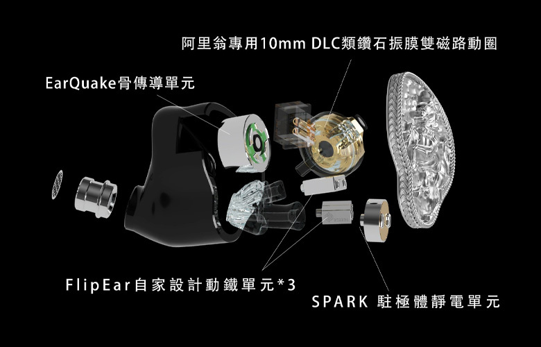 由 FlipEars 自家設計的 EarQuake 骨傳導單元,能夠藉由大口徑的設計,帶來更大的振幅以廣闊頻率的響應,加強空間感的塑造,並且帶來優秀的動態表現。由於這款單元主要負責耳機全頻的工作,因此能夠彌補不同頻段的細節清晰度,使每個結像的輪廓都可以清晰分明。