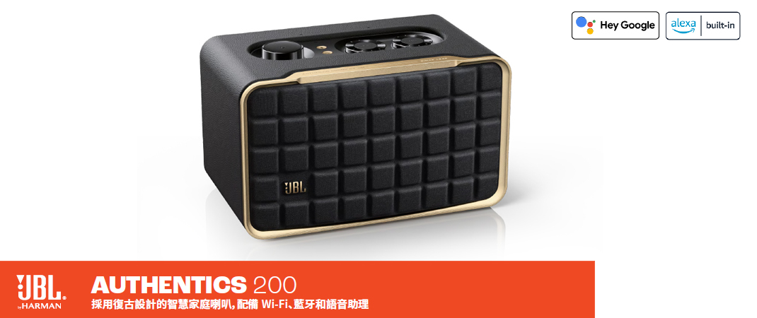 用強烈的聲音和獨特的復古風格展現個性。JBL Authentics 200 喇叭讓人聯想到 JBL 經典的 70 年代風格,配備 Quadrex 格柵、客製化皮革外殼和頂級鋁製框架, 如今,效能和多功能性更上層樓。就像在任何房間的復古設計一樣令人印象深刻, 聽起來更為出色。調高音樂音量,就能獲得大而平衡的聲音、令人驚豔的清晰度和 沈穩的低音。有了同時提供的 Google Assistance 和 Amazon Alexa,僅需使用語 音即可播放您最喜愛的音樂、控制智慧家庭裝置,並且做到更多功能。