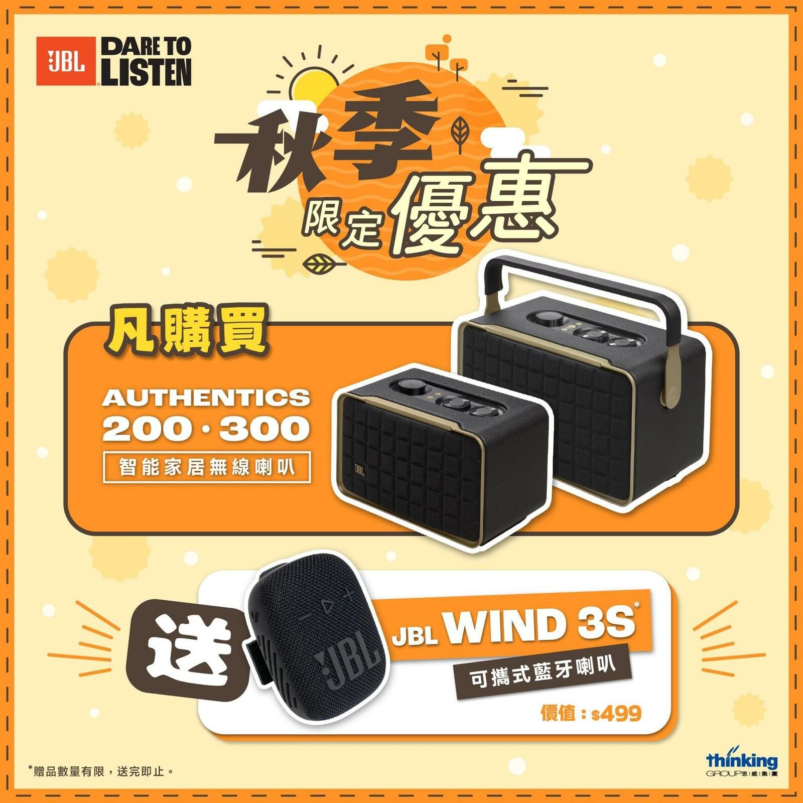 JBL 限時優惠,由即日起期間購買 JBL Authentics 200/300 智能家居無線喇叭即送 JBL WIND 3S 便攜藍牙喇叭(顏色會隨機送出)乙部(價值:HK$499)。