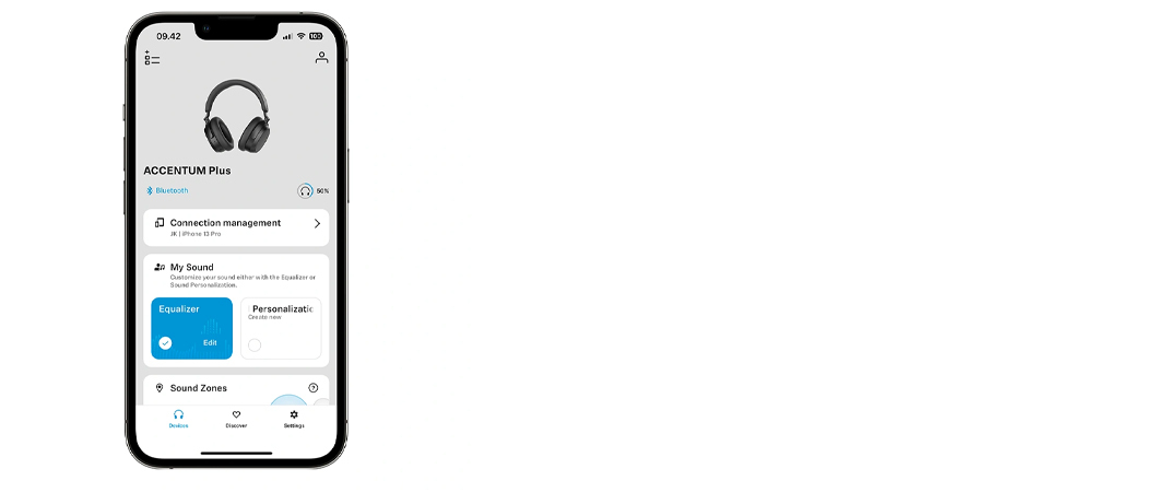 透過森海塞爾與 Fraunhofer Institute 合作開展的聲音個性化研究測試,瞭解自己的聲音特徵。使用內置的 5 段等化器隨心播放,或使用預設模式舒緩播放。