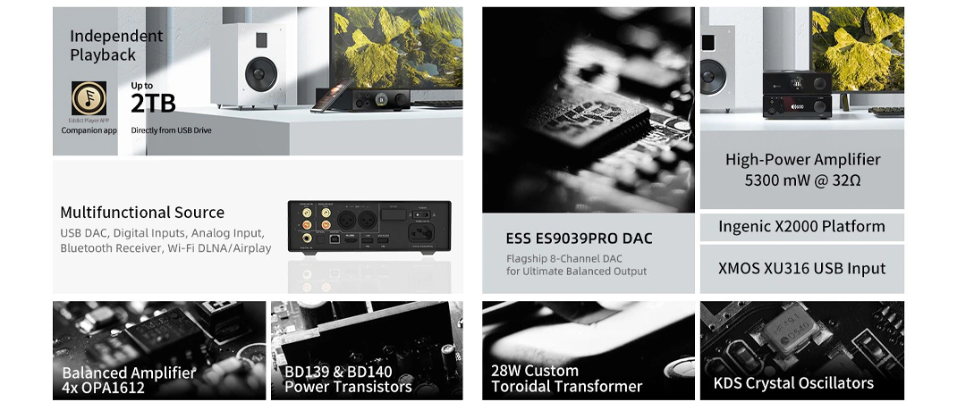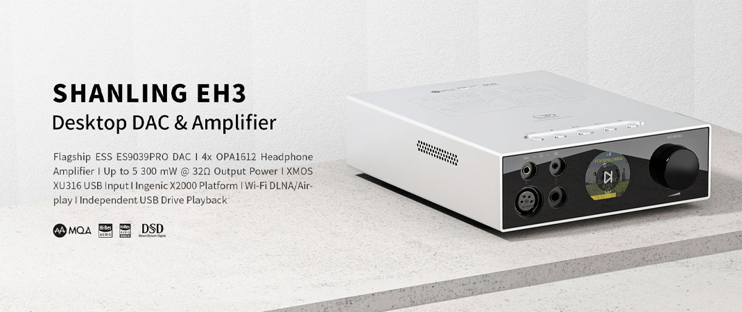 EH3 作為 Shanling 全新的台式解碼耳放產品,可謂是萬千寵愛集於一身。既有旗艦級的音頻配置,推力巨大,又擁有齊全接口、本地播放、APP 操控、WiFi 藍牙無線連接等功能配置。既是一台旗艦級的解碼耳放一體機,又是一台高規格的台式純音播放器。ES9039PRO DAC 旗艦級音頻配置
