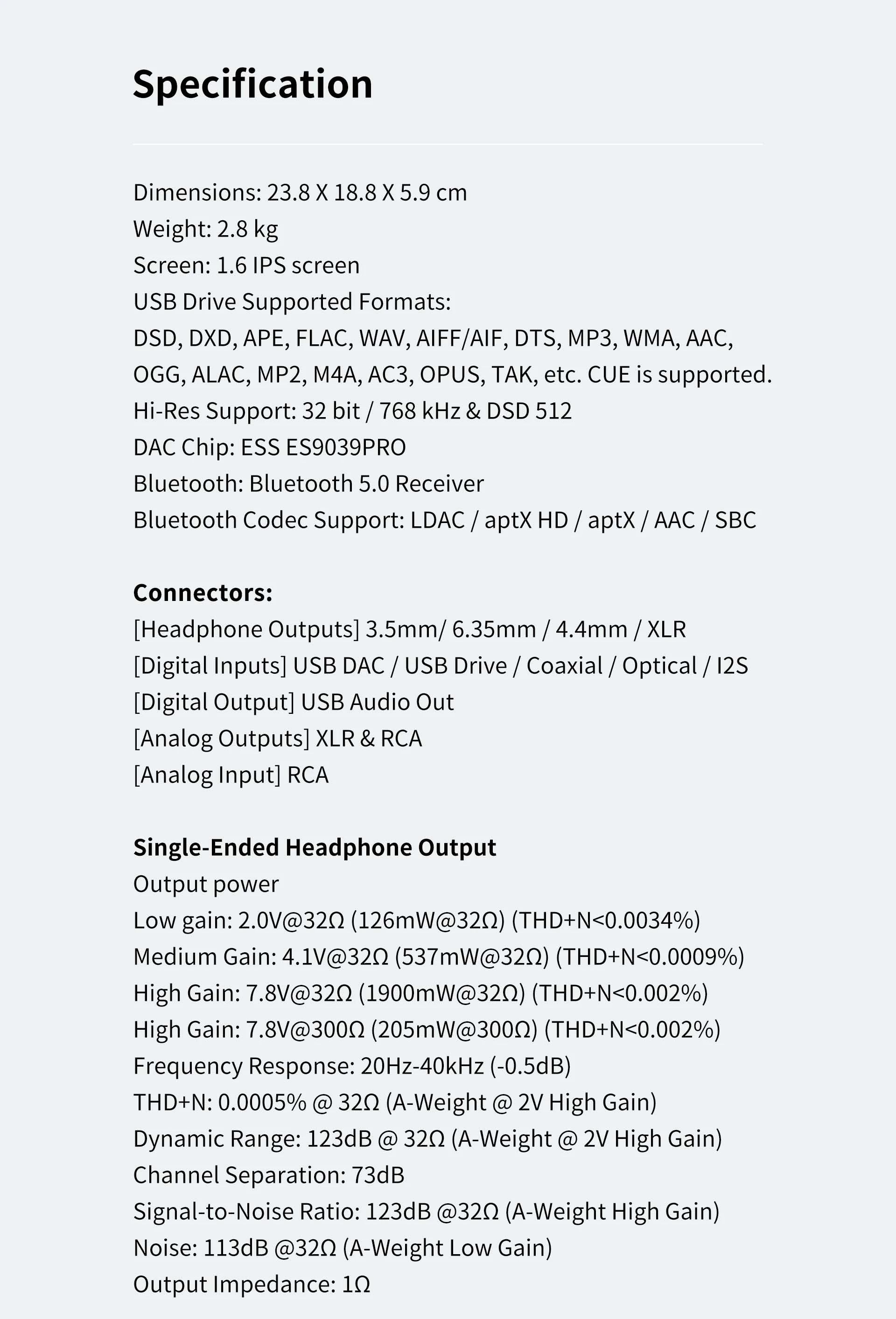 為了充分滿足台機用戶的使用需求,從立項階段,Shanling 重點考察了市面上幾個旗艦級的DAC,並對不同的 DAC 進行了部分測試,充分考慮DAC 的特質後,選擇了 ESS 最新的旗艦級 DAC ES9039PRO 。