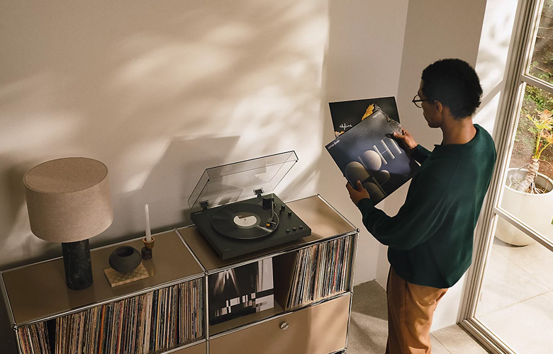 鉸鏈式透明防塵蓋有助保持唱機清潔,同時展現其俐落設計,即使在合上時亦然。防塵蓋能在播放期間或展示時保護唱機與您的唱片,兼顧功能與美感。