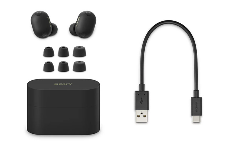 打開包裝,您會找到充電盒、USB 充電線,以及四種尺寸的耳塞套。