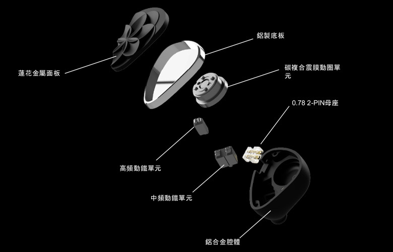 Noir Blanc 體現了自然對稱與精湛工藝的和諧統一,其靈感源自蓮花的神聖幾何形狀以及自然界最平衡形態的黃金比例。其面板設計呼應了花瓣的韻律循環,象徵純淨、平衡和聲學的均衡。每條曲線和交會處都遵循精緻的幾何形狀,在複雜中體現簡約,將外形與功能完美融合。單元配置方面將 Azla 及唐族的工程師聯合起來,開發的輕質碳複合腔動圈結合了唐族在調音中富有表現力的情感和 Azla 乾淨自然的調音,讓您聽到的每一個音符都充 滿力量、乾淨有質感。