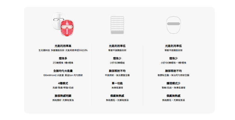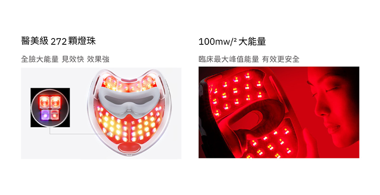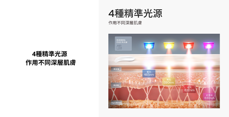 2週控油淨痘,改善肌膚暗沉 4週精準修復,全臉提亮 100mW/cm²超強能量 種精準光源,作用不同深層肌膚