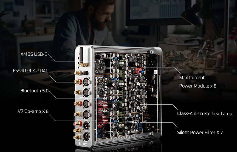 在 GT3 中,使用了兩顆 ESS9038 DAC 晶片共同處理兩個聲道。而在 GT4 中,得益於 Burson Audio 的可堆疊 Max-Current 電源模組,每顆 DAC 晶片擁有獨立的供電,並僅處理一個聲道。這種全新的設計消除了跨聲道干擾,顯著提升了細節捕捉能力。將這種全新的 DAC 架構與我們世界知名的 Burson V7 運算放大器相結合,產生的聲音富有細節,在全息音場中展現出來。