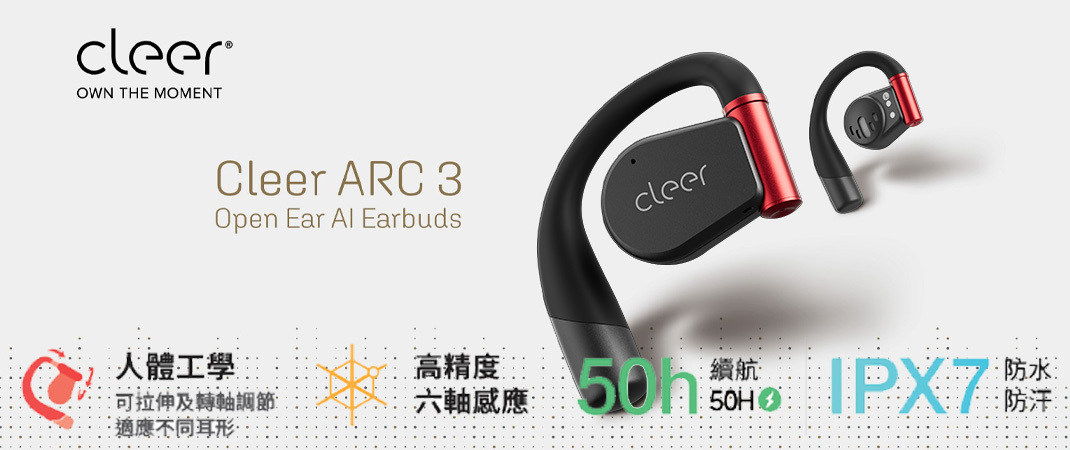 Cleer ARC III 開放式 AI 智能藍牙耳機系列的不同型號,除了集合主要共通的功能及硬件配置外,每個型號都有專屬功能,「Sports」就設有專屬「運動」音效,可根據運動節奏自動調節 EQ。超前於當今耳機概念,超越了生產技術,ARC III 加入 AI 智慧功能,令本來冷冰冰的科技產品都變得人性化。加入最新編碼技術,使聆聽質素大大提升,貼心功能、最強配置,就連生產方面都考慮到環境,低碳、可再生或回收材料,實施廢棄物最小化,減低對地球影響,用心創造新標準。