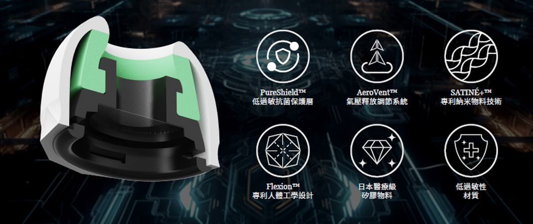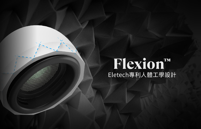 「Flexion™」的耳道形狀記憶矽膠材質讓耳膠具有彎曲並適應耳道形狀和吸收諧振的特性,使其能在遭受形變後迅速恢復原態。即使與人體皮膚接觸,也不會造成任何不適,從而提供一種自然且舒適的佩戴體驗,以達到最優的噪音隔離效果,同時避免傘帽塌陷變形而導致低頻量感損失的問題。