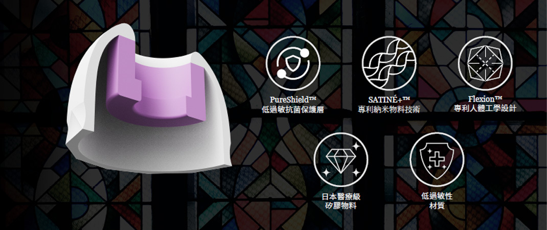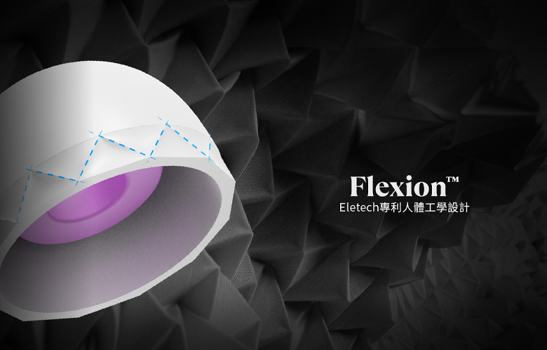 「Flexion™」的耳道形狀記憶矽膠材質讓耳膠具有彎曲並適應耳道形狀和吸收諧振的特性,使其能在遭受形變後迅速恢復原態。即使與人體皮膚接觸,也不會造成任何不適,從而提供一種自然且舒適的佩戴體驗,以達到最優的噪音隔離效果,同時避免傘帽塌陷變形而導致低頻量感損失的問題。