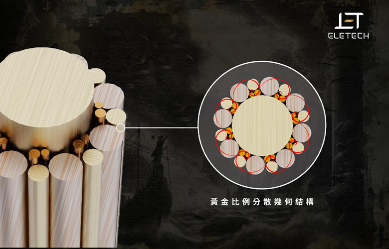 Eletech 研發出以建築學當中的黃金比例(1:1.618)為基礎的分散幾何結構,能夠精妙分配三種導體(金銀合金、金銅合金、銀銅合金)的空間、線芯粗細與排列次序。此設計確保線股間距與分佈符合黃金比例,最大化空間利用率,減少電流分佈不均,顯著降低集膚效應,提升訊號傳輸效率。黃金比例的幾何排列不僅增強線材的物理穩定性,能夠降低訊號傳輸的損耗,顯著地提升音場的立體感與微細節還原能力。每條線芯均經獨立絕緣處理,有效屏蔽電磁輻射與外部無線訊號干擾,呈現純淨深邃的音樂背景。