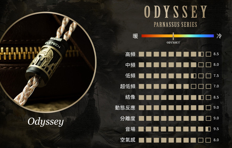 Odyssey在設計理念上承襲了過往旗艦作品Iliad與Aeneid的聲音特色,並將Odyssey視作為古希臘史詩三部曲的最終章。因此在整體設計思路上,除了融合前作的各大精髓,今次通過全新開發的「三重合金融合技術」,首次將金銀合金、金銅合金與銀銅合金三條導體物料,依照全新開發的「黃金比例分散幾何結構」進行調配,通過精妙的線股排列與訊號優化,最終創造出一個中性偏暖的音色,擁有顯著提升的分析力與微細節還原能力超高,搭配深邃的背景音場,營造出極具沉浸感的聆聽體驗。