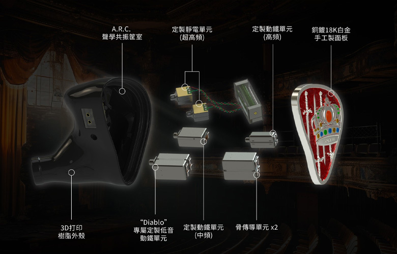 「Diablo」低音動鐵單元是 Forté Ears 顛覆市場對動鐵單元認知的革命性技術。在原型機上的反覆測試和試聽中,不少用戶反饋希望 Macbeth 能夠擁有更深邃的低頻延伸以及更豐富的低頻質量。為了滿足用戶需求,Forté Ears 與耳機單元生產商 Sonion 合作,針對兩聲道喇叭的低頻延伸參數及聽感進行重新設計,最終研發出符合現今耳機聲學效能的全新動鐵單元技術。