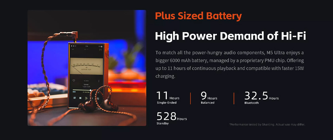 日常使用的具體表現方面,M5 Ultra 的續航時間為單端 11 小時,平衡 9 小時,作為藍牙發射器時可連續使用 32.5 小時,具體使用時間根據使用場景差別略有出入。