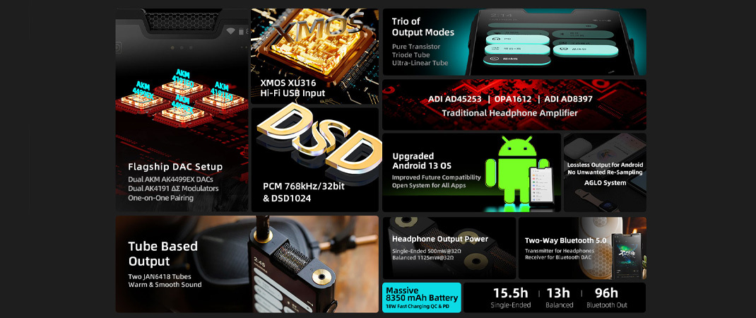在 M8T 上,工程師採用了兩顆雷神 JAN6418 電子管,分別作為左、右聲道的緩衝放大。經過此種電路設計,可以保證 M8T 即使是在電子管模式下,既能保持更加潤澤的韻味,又能保證強悍的輸出功率。 M8T 在電子管模式下的輸出功率達到最高 950mW@32Ω,晶體管模式更高達 1125mW@32Ω,充分彰顯旗艦級實力。