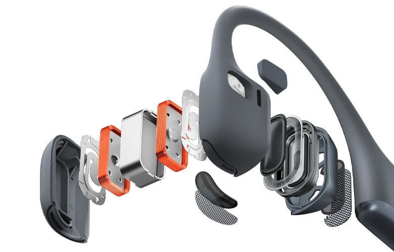 創新採用骨傳導的中高頻輸出和氣傳導的低頻輸出。再以數字分頻技術幫助其雙單元各展所長,締造沉浸式的聼感。全新升級高音單元,採用全金屬超薄剛性結構。加入雙音圈的强勁推力及雙簧片振動系統穩定輸出,提升音質表現。超高精度組裝工藝,一體化設計,創造出細節豐富的純净音質。使高音延展清脆,中音飽滿動人。低音單元採用定制 18mm × 11mm 超大環形振膜,外圈環繞柔性折環,大振幅下的振膜依舊穩定,即使音量大亦保持真實;配合背向發聲結構,帶來平衡音效、澎湃低音。