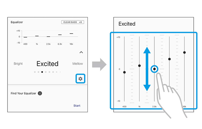 根據個人喜好調校音效。從一系列預設音效中,選出與所播放音樂類型相配的一種,或使用自訂 EQ 功能自行建立預設並儲存在 Sony | Sound Connect 應用程式中。