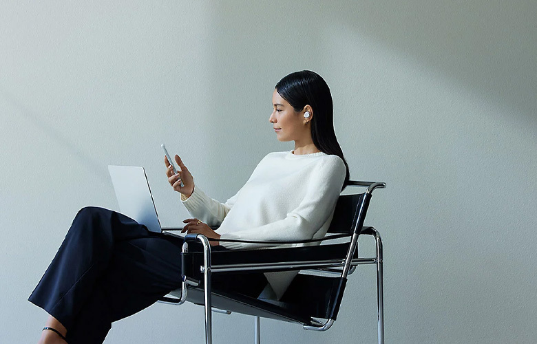 多點連接功能可讓 WF-C710N 耳機同時與兩部藍牙裝置配對。若在一部裝置聽音樂時,另一部裝置來電,音樂自動暫停,而通話自動切換到另一部裝置上。通話結束後,音樂會自動恢復播放。